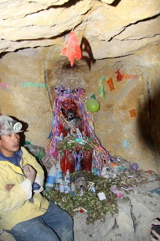 Parfois, les trous les plus profonds ont une utilité. Les puits équipés de treuils électriques permettent de hisser le minerai d’un niveau à un autre. Après un bon moment, nous avons d’ailleurs perdu toute notion du temps, Freddie nous invite à descendre par un trou dans le sol. Ce sont trois échelles verticales qui se succèdent. Ainsi nous pouvons poursuivre la promenade trois niveaux plus bas. Il flotte dans l’air une odeur très particulière qui nous colle d’ailleurs pendant le reste de la journée. De temps en temps, nous apercevons quelques veines de minerai qui zèbrent les parois ou le plafond. Quelques-uns d’entre nous gratouillent pour essayer de récupérer un petit bout. Nous pourrions nous enfoncer encore de trois niveaux mais nous préférons rebrousser chemin. Il faut en particulier affronter à nouveau les échelles. Sur le coup de midi, nous commençons à entendre des bruits sourds. Les explosions de dynamite ont commencé : une dizaine en tout. J’ai l’impression d’entendre craquer, puis nous ressentons les vibrations. Nous continuons ainsi jusqu’à une centaine de mètres de l’entrée. Là, nous empruntons une galerie annexe sur notre gauche. Au bout de quelques dizaines de mètres, nous découvrons enfin l’antre d’El Tio. Cette divinité diabolique est présente dans toutes les mines. Il est considéré comme le propriétaire du sous-sol. De fait, la croyance des mineurs est très forte. Celui-ci est recouvert d’offrandes : feuilles de coca, alcool, cigarettes. El Tio, représenté en pied, arbore une couleur rouge diabolique et un sexe disproportionné, symbole de fertilité. Il est encore couvert de cotillons, restes du dernier carnaval. A ses pieds, nous trouvons Saturnino une autre divinité, seulement représenté par sa tête. Freddie procède aux offrandes rituelles : quelques feuilles de coca ici et là, quelques gouttes d’alcool à droite et à gauche ainsi qu’une cigarette allumée pour chacun. Elle fume bien : c’est bon signe. Après avoir goutté à ce tord-boyaux titrant 96°, Freddie fait une série de vœux puis nous propose de goutter. Ca envoie du lourd : décapage assuré ! Il ne reste plus qu’à parcourir les derniers mètres pour retrouver l’air libre puis un tour de minibus pour retrouver notre tenue normale puis l’hôtel.