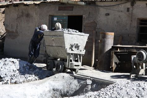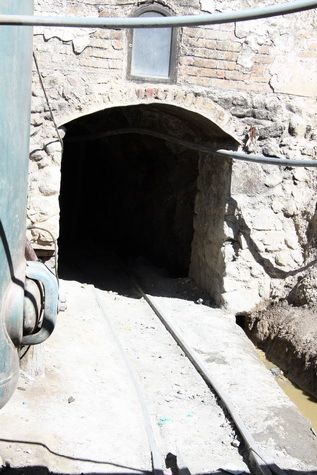 Après ce show pyrotechnique, nous reprenons la piste pour rejoindre l’entrée de la mine que nous devons visiter. Le trou ne paye pas de mine, caché qu’il est par le compresseur. Des rails en sortent et rapidement nous voyons arriver deux wagonnets remplis de minerai. Dehors, quelques mineurs assurent un premier tri. Tous ont la joue distendue par la boule de feuilles de coca qu’ils chiquent. Dans les déblais, ils extraient de l’argent, du zinc et du plomb. Après avoir partagé une partie de nos présents entre les mineurs de l’extérieur, nous rentrons enfin dans l’antre du Cerro Rico. Lumière très rapidement indispensable. Nous marchons entre les rails. Le casque prouve très vite son utilité : la hauteur de plafond est très variable, rarement adaptée pour un basketteur. Idem pour les bottes au bout de quelques mètres : l’eau est partout ou presque. Quant aux surcouches, elles préservent de la poussière, de la boue, et parfois de la graisse. Nous marchons ainsi en file indienne dans les diverses galeries, croisant régulièrement des wagonnets vides ou pleins, poussés par deux mineurs seulement pour plusieurs tonnes de chargement. A chaque fois, nous leur laissons un petit quelque chose. C’est l’occasion de se rendre compte de la dureté de leur labeur. Dans les bouts de galerie, nous ressentons la présence de la poussière en suspension. Il faut aussi faire attention où on met les pieds, sous peine de finir au niveau inférieur.