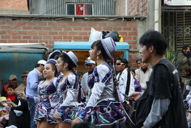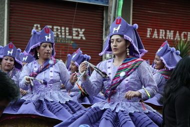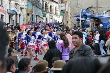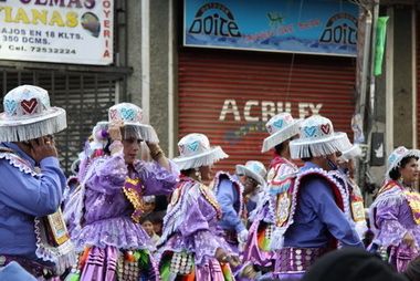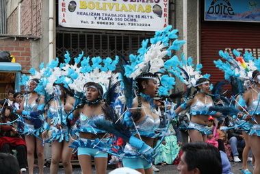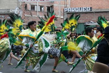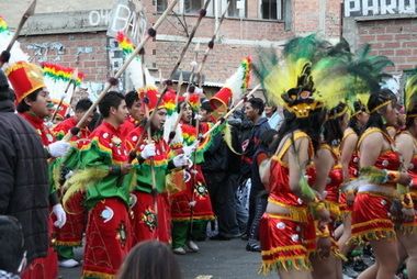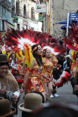 Il faut un long moment et de nombreux détours à notre chauffeur pour nous déposer devant l’hôtel, au centre des festivités. La récupération des clés est des plus rapides pour descendre au plus vite voir la fête la plus importante de la ville de La Paz. Le Gran Poder consiste en un immense défilé à travers la ville de groupes de danseurs et de musiciens, vêtus de tenues chatoyantes, plumes masques, … Tous exécutent des danses traditionnelles. La foule est nombreuse tout au long du parcours d’un spectacle qui dure des heures, jusqu’à tard dans la nuit. Sur l’avenue principale, il est même impossible de voir quoi que ce soit du défilé avec la présence de tribunes réservées dès le matin. Les contre-allées n’en restent pas moins très animées avec toutes sortes de vendeurs et d’organisateurs de jeux anciens. Il y en a pour tous les goûts et toutes les odeurs. Au fil des heures, nous commençons à voir des participants au défilé dans les rues transverses. La fatigue commence à se faire sentir. Pourtant la grande majorité continue à défiler en chantant et en dansant. Il est vrai que le public les ravitaille, souvent en bière ou autres alcools. Nous retournons à l’hôtel pour retrouver le groupe et prendre notre dernier repas en Bolivie. Une surprise nous y attend lorsqu’en fin de repas, le serveur nous apporte un pot recouvert d’un tissu opaque. A l’intérieur se trouve un cobra plongé dans l’alcool. Cela n’encourage pas vraiment à goûter !