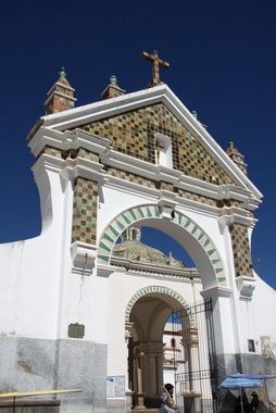 Au-dessus de la porte principale a été placée une vierge de Copacabana mêlant symbolique catholique et symboles indiens. Juste en- dessous, le portail de bois finement sculpté raconte l’histoire de Yupanqui et de la vierge de Copacabana. Assez étrangement, la nef est relativement petite comparée à l’impression laissée à l’extérieur. Les voûtes sont peintes de couleurs très vives et voyantes. Derrière l’autel se dresse un imposant retable d’or et d’argent dans le plus pur style baroque-mestizo. Autant dire très chargé. Là encore nous retrouvons la présence de la symbolique indienne avec les trois niveaux : ceux du condor, du puma et du serpent. Sur le côté droit est installée une réplique de la vierge de Copacabana, initialement réalisée en ivoire. En sortant dans l’axe de la nef, nous trouvons l’accès à la chapelle des bougies, un endroit bien sombre où les croyants viennent déposer des bougies par paquets et demander une faveur à la vierge.