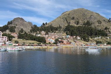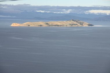 En revenant sur la place principale, nous pouvons apercevoir les deux rites qui se font face : le calvaire chrétien au sommet du Cerro Calvario et l’observatoire pré-inca derrière l’église, sur le Niño Calvario. Nous poursuivons notre visite de l’autre côté de la place sur le petit marché alimentaire. Nous pouvons y voir aussi tout un tas de « graines » ainsi qu’un énorme pop-corn, spécialité de la ville. Après le repas, nous continuons à descendre jusqu’à la plage de Copacabana. Là, nous montons à bord d’un petit bateau qui doit nous mener à la Isla del Sol (Ile du Soleil). Nous nous répartissons entre l’intérieur et le toit où sont installés deux bancs, pour profiter de la grosse heure de navigation à allure plutôt réduite. Nous longeons dans un premier temps l’extrémité de l’île de Copacabana avant de couper à travers une étroite passe. Nous croisons quelques rares embarcations : un catamaran de tourisme et un hydrofoil plus lointain. Il ne reste ensuite qu’à rejoindre la pointe sud de l’île, sous le site de Pilko Kaina ; lieu de notre débarquement.