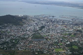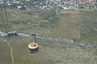 Sous nos yeux la longue baie du Cap s’étire, formant un long croissant. Au centre, nous apercevons Robben Island, l’île qui servit de prison pendant 18 ans à Nelson Mandela. Juste à nos pieds s’élèvent les tours du quartier d’affaires, juste avant le port, lui-même suivi du Waterfront, le quartier commercial et touristique. Au bout du Signal, nous distinguons le stade de la future coupe du monde de football. Pour le reste, il faut les jumelles pour distinguer le détail de chaque quartier. La descente en téléphérique est vertigineuse avec ce départ très abrupt. D’ailleurs, elle semble beaucoup plus rapide.