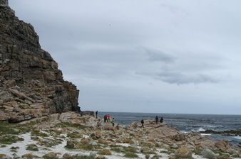 Comme les réserves « animalières », celle du Cap est protégée par une « gate » où s’acquitte le droit d’accès. La route sinue ensuite au milieu d’une végétation généralement rase. Quelques fleurs sont déjà visibles, telles les protéas jaunes ou encore les géraniums sauvages. Quelques rares bâtisses anciennes servent de centre d’information pour les visiteurs. Un peu plus loin s’élèvent deux croix. Celle de droite, mi-blanche, mi-noire, perchée sur la colline rappelle que Bartolomeo Dias a débarqué ici tandis que la seconde située en contrebas face à False Bay commémore le passage d’un second explorateur portugais, Vasco de Gama.