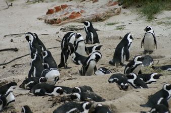 Nous repartons désormais vers le nord jusqu’à la sortie de la réserve. Là, nous partons le long de la côte de False Bay. Les baleines, potentiellement visibles dans ce coin, ne se montrent pas. Nous nous arrêtons à Boulders Beach. Ce quartier de Simon’s Town doit sa réputation à ses pingouins du Cap qui ont élu domicile à cet endroit. Dans le passé, on pouvait les retrouver un peu partout dans la ville. Désormais, ils sont cantonnés dans une réserve des parcs nationaux implantée sur la plage. Il faut aller au bout de l’impasse qui part du parking pour en trouver l’entrée. Des passerelles en bois ont été aménagées au-dessus du sable et des rochers. Je n’aperçois d’abord rien si ce n’est des cuves plastiques à moitié enterrées qui doivent leur servir de nid. Ce n’est que dans la seconde portion que les pingouins font leur apparition. D’abord un solitaire qui semble se complaire à poser pour les photographes qui défilent devant lui.