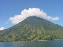 Malgré une nuit un peu plus arrosée que de raison (mais on a tellement ri !!), nous parvenons à nous réveiller tôt comme à l’habitude. Ce matin, nous partons pied de l’hôtel pour rejoindre les pontons du lac Atitlan. Celui-ci, très sombre, est dominé par trois massifs volcans qui s’imposent par leur masse (le Toliman, l’Atitlan et le San Pedro), tous à plus de trois mille mètres. On se sent tout petit au pied de ces géants et on espère qu’ils ne vont pas exploser tant qu’on est là. Par bonheur, ce matin, le ciel est bien bleu ; les quelques nuages forment d’élégantes chevelures argentées au sommet des cônes volcaniques. Nous embarquons sur un petit bateau qui va nous faire traverser le lac de part en part jusqu’au pied du volcan Toliman qui culmine à 3158 m. on se rend bien mieux compte de la configuration de ce lac engoncé dans ces falaises volcaniques. En fait, il s’agit d’une caldera qui a fini par se remplir jusqu’à former une étendue d’eau de 128 km² pour une profondeur atteignant les 320 mètres. Ceci explique la couleur si sombre du lac. Nous profitons de la traversée d’environ une heure pour prendre le soleil sur le pont du bateau, mais aussi pour faire de superbes photos dans ce cadre enchanteur. Les couleurs sont superbes : le vert des volcans tranche parfaitement sur le bleu du ciel et le « noir » de l’eau du lac.