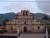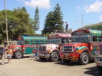 8h30 annonce l’heure du départ. Nous quittons Antigua pour Chichicastenango. Cette petite ville semble comme isolée du reste du Guatemala, entourée qu’elle est par les montagnes. Durant deux heures, nous empruntons des routes de montagne plutôt pentues, et parmi elles la célèbre panaméricaine qui traverse le continent du nord au sud jusqu’à Ushuaïa en bas ! Les plateaux sont, eux, couverts de nombreuses cultures vivrières (maïs, haricots, courgettes, ...). Ce trajet est aussi l’occasion de voir les bus locaux, tout particulièrement au niveau de Chimaltenango lorsque on rejoint la panaméricaine. Accrochez-vous aux sièges : ça roule n’importe comment, attrapant certains aux passagers au vol, sans même s’arrêter, et laissant derrière un énorme nuage de fumée. Nous découvrons aussi combien le pays Quiché est volcanique : nous sommes toujours sous la surveillance plus ou moins lointaine d’un cône volcanique avec sa blanche chevelure nuageuse.