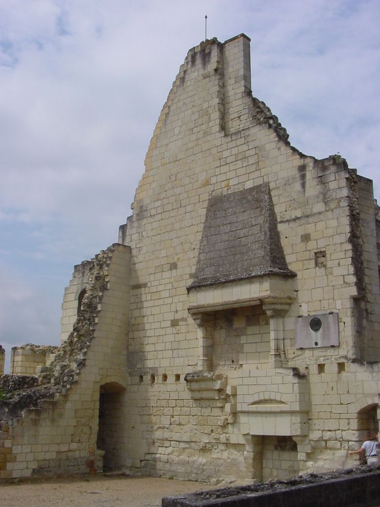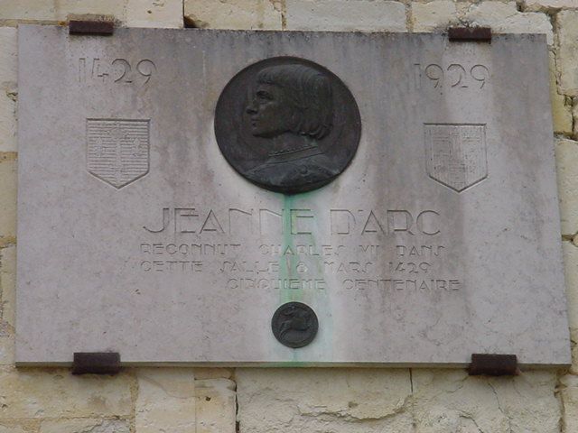 La visite commence vraiment avec le château dit du Milieu. C'est en passant sous l'arche de Tour de l'Horloge qu'on pénètre vraiment sur les lieux. Une fois dans l'enceinte, on se rend compte que cette tour a une forme bien originale. On pourrait la comparer à un immense livre qu'on aurait posé à la verticale. Un clocheton couronne la toiture rénovée et abrite une cloche. Avant de terminer la visite, il ne faut pas oublier d'y pénétrer. Ses intérieurs servent d'espace muséal consacré à la Pucelle de Domrémy. L'esplanade qui s'étend derrière est quasi vierge de bâtiments. Des arbres ont colonisés les lieux. Il faut atteindre l'extrémité ouest de ce fort pour voir les ruines des logis royaux, qui dominent la ville blottie au pied de la falaise et la Vienne. Il n'en reste que les murs ainsi qu'une cheminée comme suspendue dans les airs en mis hauteur. A sa droite, on ne peut pas manquer la plaque qui rappelle que dans cette pièce se serait déroulée la rencontre entre Jeanne d'Arc et le roi.