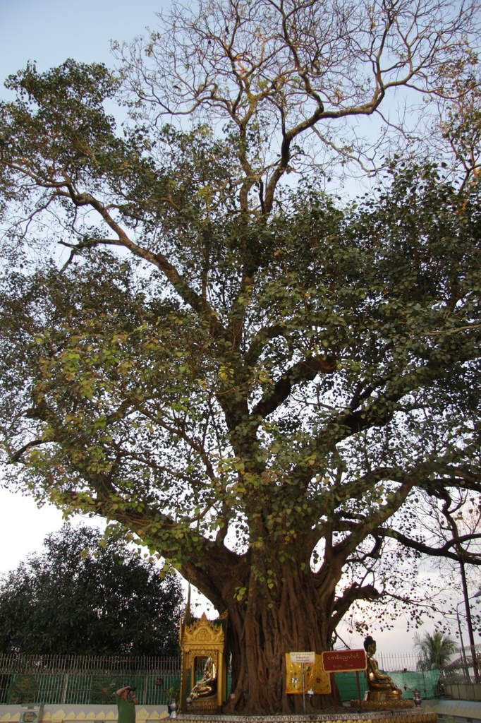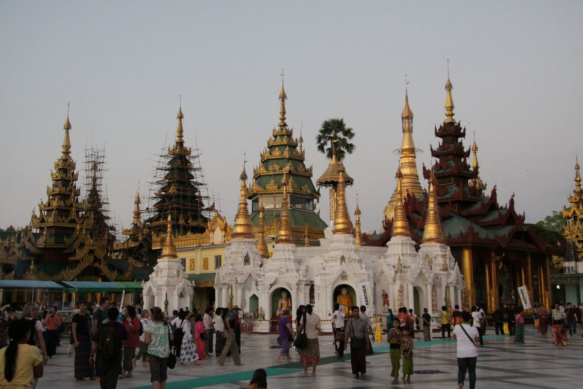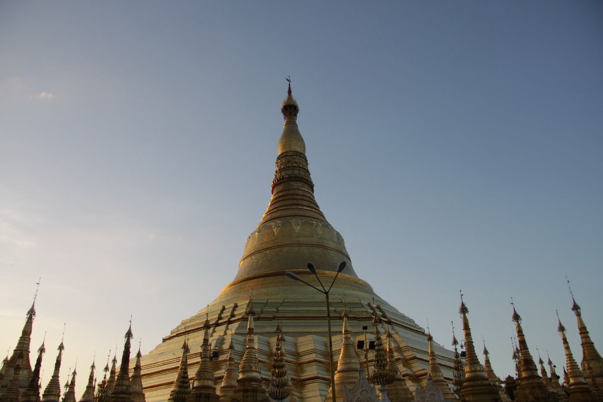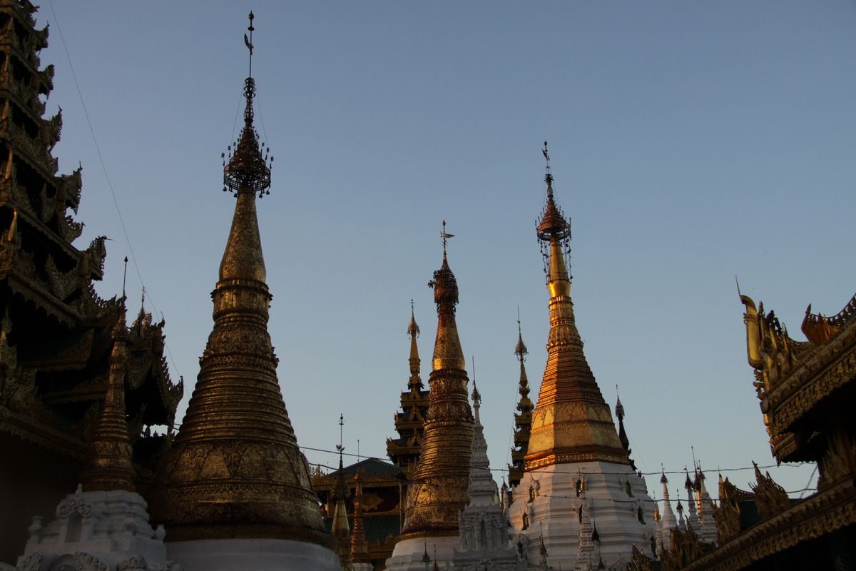 L’heure ayant bien avancé, nous inversons le programme. Nous retournons une dernière fois à la splendide pagode Shwedagon, un vœu que nous avions émis depuis quelques jours déjà. C’est d’abord dans les chaudes lumières du couchant que nous la redécouvrons sous un jour nouveau, puis nous déambulons laissant la nuit s’installer, les lumières des projecteurs remplacer celles du soleil pour habiller le stupa de sa plus belle parure. C’est alors que nous apercevons quelques moines franchir les grilles au pied de celui-ci, monter sur les terrasses et, a priori, ramasser tout ce qui aurait pu tomber de l’ombrelle sommitale. Seuls des religieux peuvent fouler ce stupa sacré. Par leur présence, ils donnent encore plus de dimension au site, tant ils apparaissent tout petit sur ce fond doré.