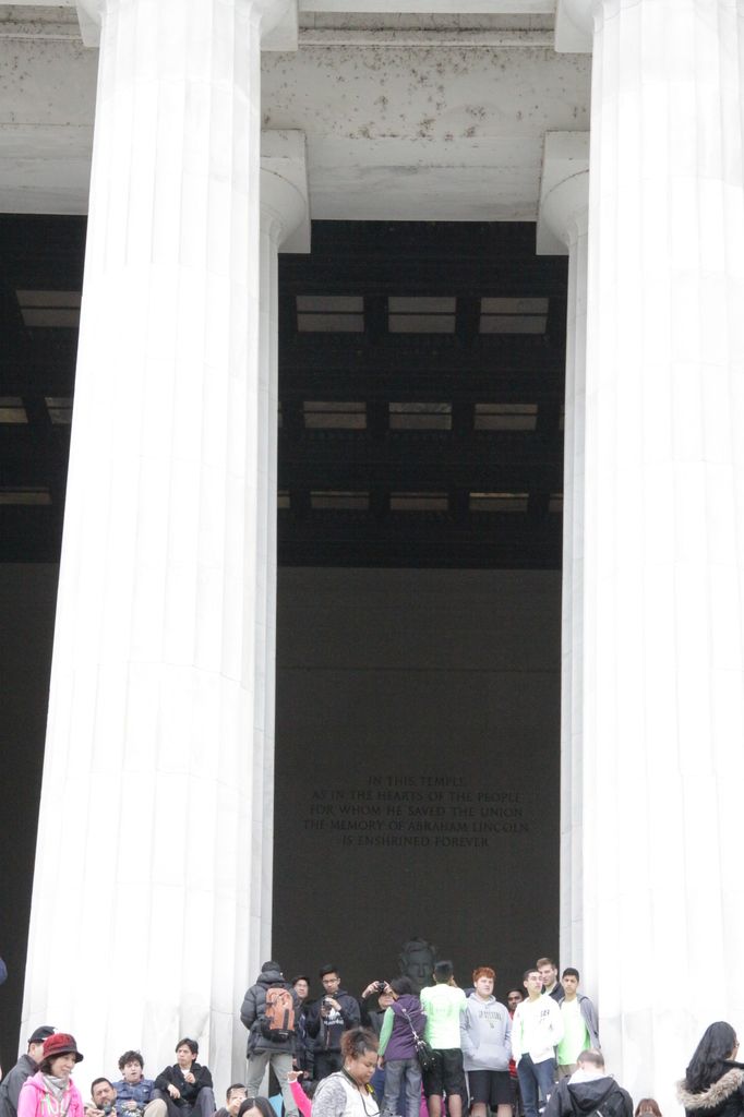 Mais cette première impression n'est rien. De l'autre côté de l'édifice, le mémorial prend toute sa majesté. Ainsi planté à l'extrémité du National Mall, il fait le pendant au Capitole à l'autre bout. A plus courte portée, le Reflecting Pool, tout en longueur, sert de parfait miroir au "temple". Nombreux sont les gens à gravir et se masser sur cet escalier monumental qui mène à l'intérieur. C'est là que se trouve Lincoln, ou plus exactement sa statue, assis comme sur un trône, les montants du siège figurant les faisceaux de l'autorité de la république, et le regard portant loin, vers le Mall. Six mètres de haut pour six mètres de larges, l'effigie de l'illustre président assassiné en impose encore de nos jours. Les deux murs latéraux dans les annexes exhibent deux discours de l'ancien président.