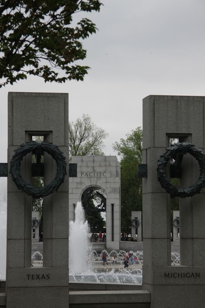 En approchant on devine un immense ovale cerné de cinquante six piliers de granit, chacun gravé intérieurement et extérieurement au nom d'un état ou territoire américain impliqué. Aux extrémités nord et sud, deux "arcs de triomphe", un pour l'atlantique, l'autre pour le pacifique, permettent d'accéder au coeur de l'édifice. Un grand bassin occupe une bonne partie du mémorial avec différents jets d'eau. Côté ouest, face au mémorial Lincoln, deux déversoirs alimentent le tout. Visuellement, le regard se retrouve au ras des pelouses du Mall et le bloc de Lincoln s'impose d'autant plus.