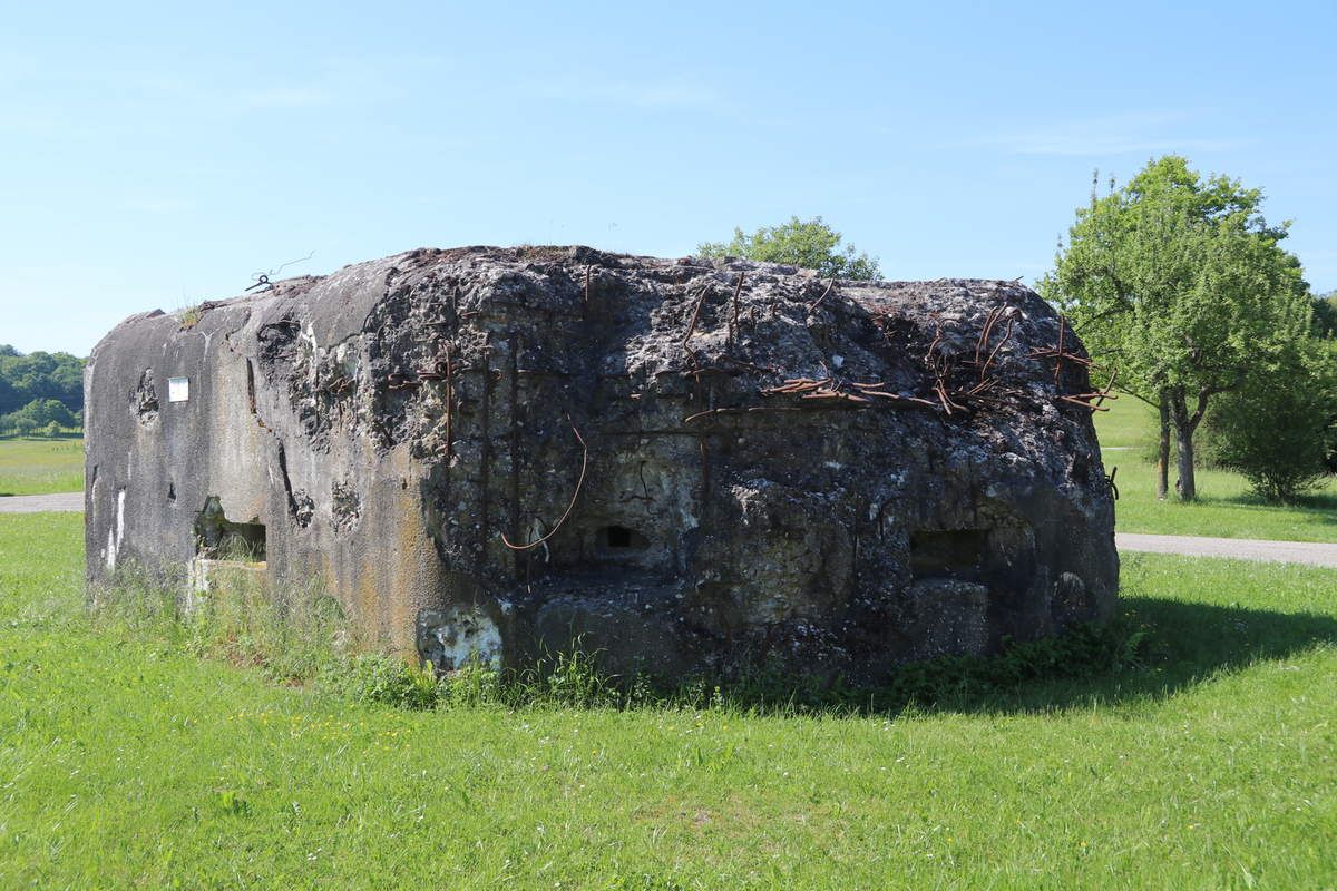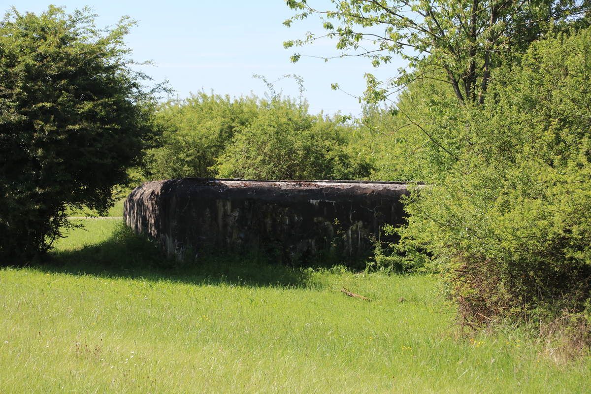 Je continue ma route, retrouvant entre Marienthal et Macheren une nouvelle série de fortifications. Du petit parking aménagé au bord de la route, un chemin s'enfonce sous les arbres reliant divers blockhaus semblant surveiller le second village, en contrebas. On distingue au sol un renfoncement qui marque une ancienne tranchée qui permettait de passer d'un ouvrage à l'autre en toute sécurité.